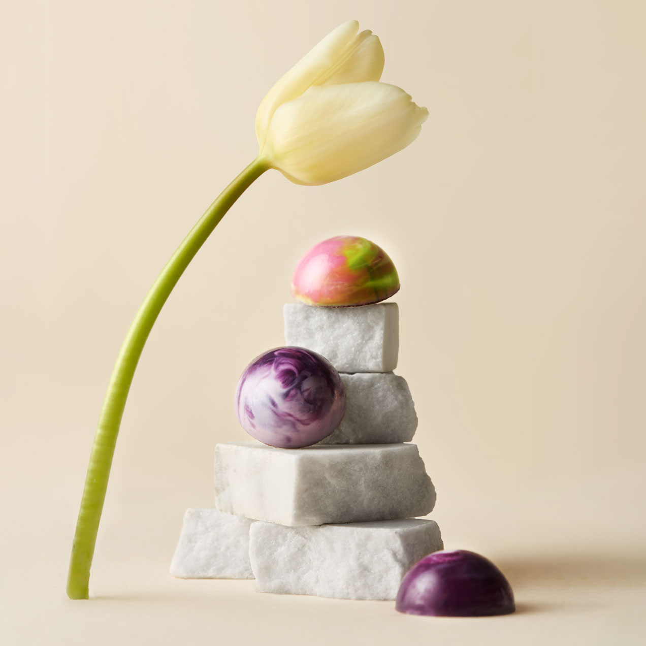 Sastojci: tamna čokolada (kakao masa, šećer, kakao maslac, emulgator sojin lecitin, prirodna aroma vanile. Kakao delovi: 70% min.), bela čokolada (šećer, kakao maslac, punomasno mleko u prahu, emulgator sojin lecitin, prirodna aroma vanile. Kakao delovi: 28% min.), mlečna slatka pavlaka, mlečni maslac, sušena šumska borovnica, koncentrisana voćna pasta šumsko voće (šećer, glukozni sirup, borovnica, jagoda, malina, kupina, koncetrovani sok jagode, regulator kiselosti: limunska kiselina, zgušnjivači: pektin, arome, prehrambene boje – ekstrakt crne šargarepe, karamel), kandirana narandžina kora (narandžina kora, šećer, glukozno-fruktozni sirup, limunska kiselina),sušena višnja, koncentrisana voćna pasta od višnje (višnja, šećer, glukozni sirup, sok od višnje, regulator kiselosti: limunska kiselina, zgušnjivači: pektin, arome, prehrambene boje – karamin, indigo, ekstakt crne repe, karamel), liofilizovana malina, boje E100, E120, E133, E171, etarsko ulje nane. Mogući tragovi jezgrastog voća, kikirikija, susama i glutena.